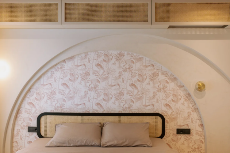 Noćna zona je izdvojena i oblikovana tako da pruži spokoj i intimu. Master spavaća soba oplemenjena je nežnim akcentima – tapetama, asimetričnim slojevima iza uzglavlja, detaljima od ratana i posebno osmišljenim zakrivljenim zidom koji s druge strane skriva kadu.