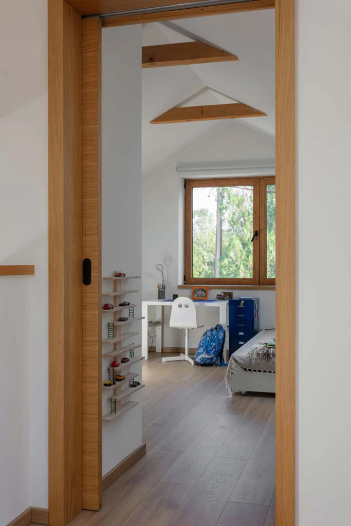 Noćna zona organizovana je na gornjoj etaži kao intimniji, privatniji deo prostora, ali uz ostvarivanje vizuelne veze sa donjim nivoom putem otvorene galerije, te sa okolnim pejzažom kroz kružni prozor koji dominira zabatnim zidom orijentisanim prema dvorištu.