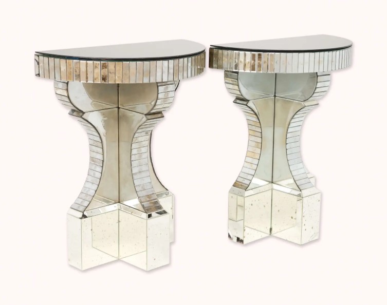 Ove dve elegantne konzole krasile su dom uspešne agentkinje za nekretnine Sime. Njihov oblik i simetrija podsećaju na stil francuskog dekoratera Sergea Rochea. Procena – 800-1.200 dolara.