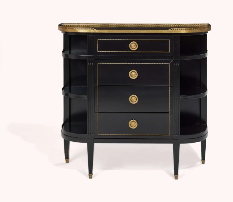 Napravljen od crno lakiranog drveta, ovaj polukružni komad u stilu Luja XVI nekada se nalazio na prvom spratu stana Keri. Ukrašen perforiranom mesinganom trakom na gornjoj ivici, ima usklađene ručke, četiri fioke i otvorene police sa zaobljenim ivicama, na suženim četvrtastim nogama. Procena – 1.000-2.000 dolara.