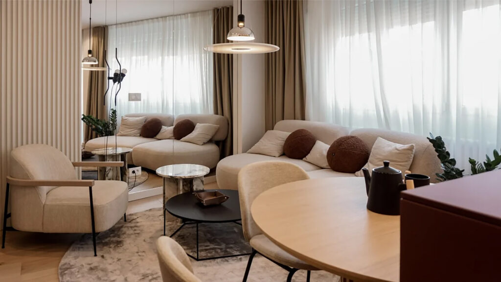 Meke, zaobljene forme, zavese i draperi, tepisi i ostali tekstil doprinose slojevitosti i utiču na poboljšanje akustike. Svaki estetski element ima i funkcionalno opravdanje.