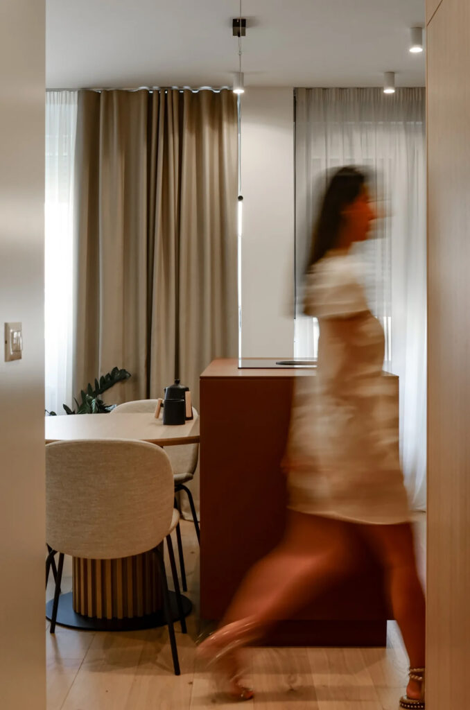 Stan je podeljen na jasno definisane, ali vizuelno povezane segmente. Dnevna zona je otvorenog plana i obuhvata boravak, trpezarijski deo sa malim stolom integrisanim u kuhinjski pult, i kompletno opremljenu kuhinju, iz koje se izlazi na terasu. Promišljenim uklapanjem svih elemenata stvoren je kompaktan dnevni ambijent cirkularne strukture, u kome je kretanje fluidno i lako. Velike ogledalske površine stvaraju utisak dubine prostora i vizuelno ga uvećavaju.