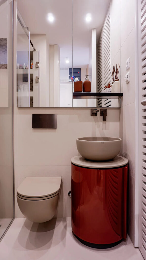 Zahvaljujući otvorenosti, dobroj saradnji i poverenju klijenta, enterijer je u potpunosti realizovan u skladu s projektom, bez odstupanja, te stoji kao dokaz da mali stan može imati snažan identitet, funkcionalnost i arhitektonski integritet.