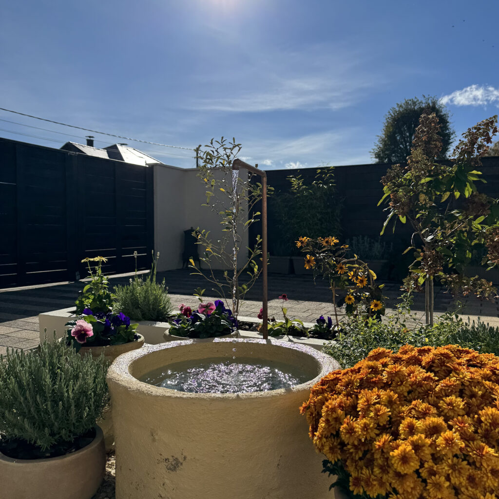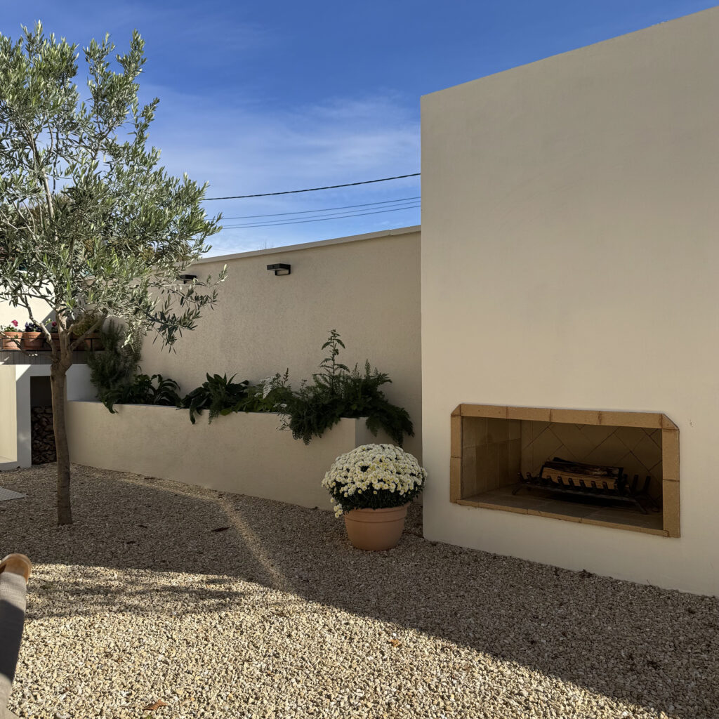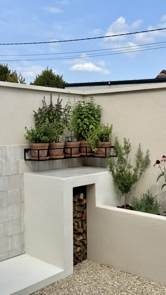 „Visoke gredice za cveće napravljene su tako što smo označili unutrašnju dubinu gredica i krenuli zidanjem betonskom ciglom. Nema temelja (kuhinja i kamin imaju temelje) već smo na oko 10cm dubine nabili šljunak i na to počeli sa zidanjem. Nakon toga napravljen je betonski venac gore sa armaturom da se sve poveže. Mrežica je pričvršćena lepkom i na to se išlo strojnom cementnom žbukom koja se nanosila ručno, ne bi li se dobila željena tekstura. Iznutra smo ih sve premazali hidoizolacijom i dodatno stavili čepastu foliju. Zadnji korak bio je bojenje spoljnom betonskom bojom Takril u nijansi 160E. Takav način sadnje omogućava mi lakše dodavanje/pomeranje biljaka, manje prljanja i lepšu preglednost. To mi je bilo važno jer smo se umesto trave na ovom delu dvorišta odlučili za sitne kamenčiće koji imaju ispod rešetku pa se uopšte ne miču.“