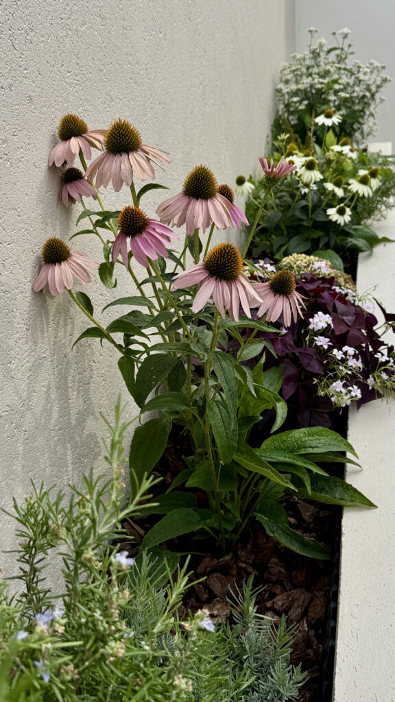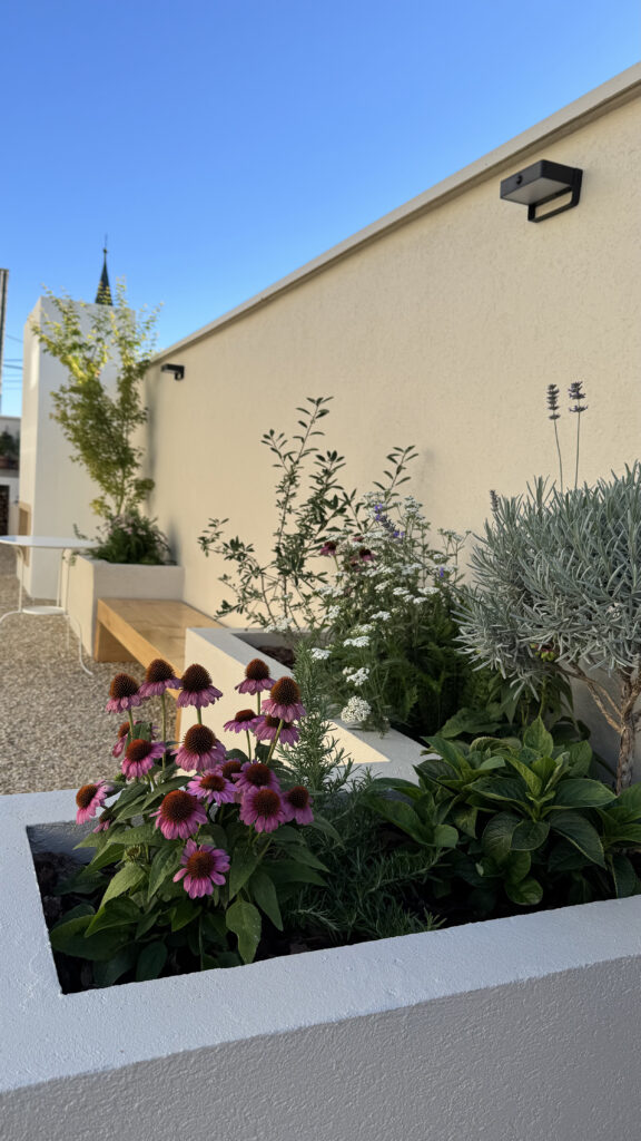 „Mini japanski žuto-zeleni javor je listopadni, mini magnolija takođe, dok su masline i bambusi u pozadini zimzeleni. Od manjih biljaka tu ima ruzmarina, lavande, adende, nane, ehinaceje raznih boja, stolisnika i mnogih drugih. Početkom ovog meseca posadila sam i poneki dan-noć između biljaka, a onda i puno lukovica koje će na proleće krasiti visoke gredice. Ta raznolikost biljaka i kombinacija roze, plave i žute boje vesele me jer daju dinamičnost dvorištu koje je prilično neutralno“, kaže Ingrid.