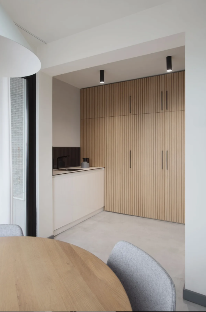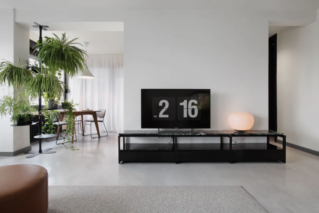 Funkcionalna i dekorativna rasveta modernističkog prizvuka i umetnički komadi dodatno oplemenjuju prostor ovog stana.