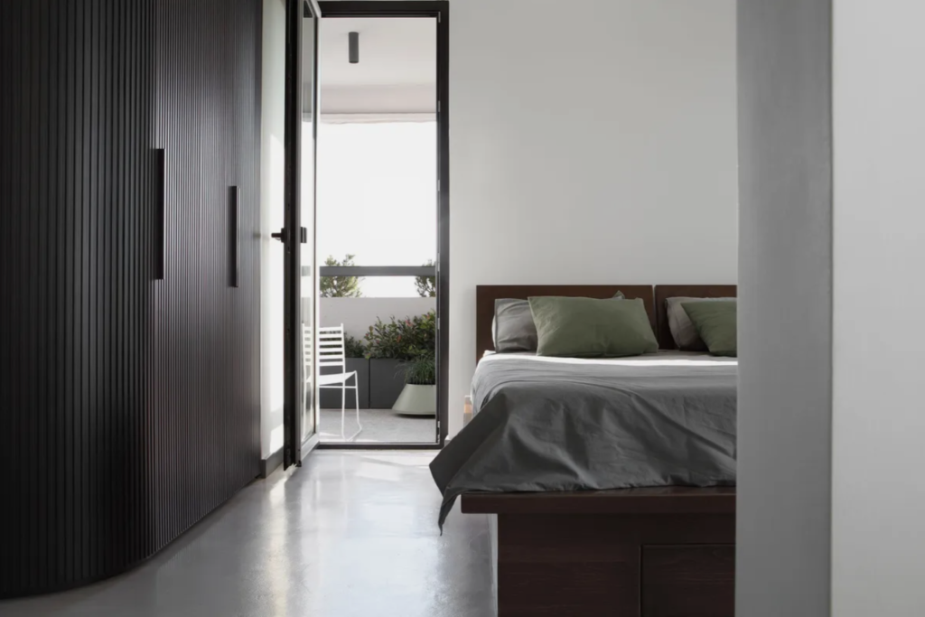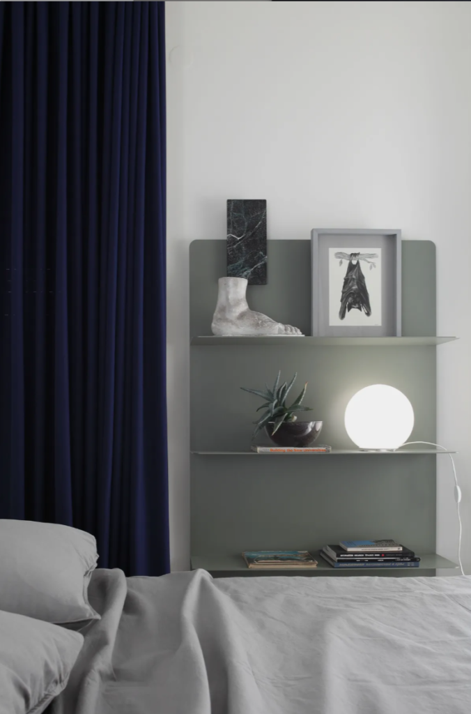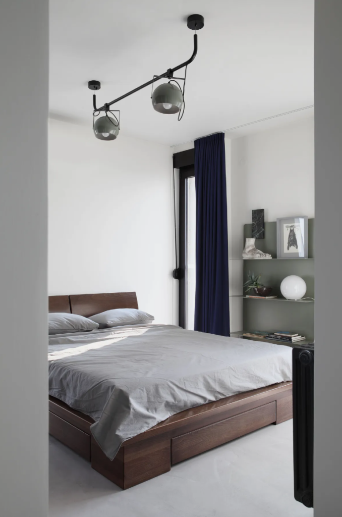 Noćna zona prati istu estetsku matricu svetlih neutralnih tonova, kojoj je dodat kontrast drvenog okvira kreveta tople tamnobraon nijanse i teških drapera boje teget mastila.