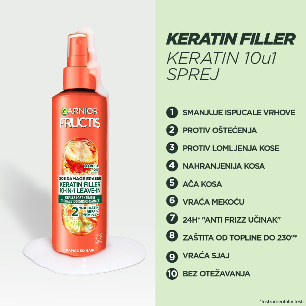 Među najpopularnijima je sprej Garnier Fructis 10u1 Keratin Hair Filler Spray, proizvod koji je zasluženo dobio nadimak čudo u bočici. Tajna njegove moći je u specifičnoj formuli koja, između ostalog,sadrži 2% obnavljajućeg keratinskog kompleksa i ulje marule, a koja deluje kao mini-rekonstrukcija kose na prskanje.