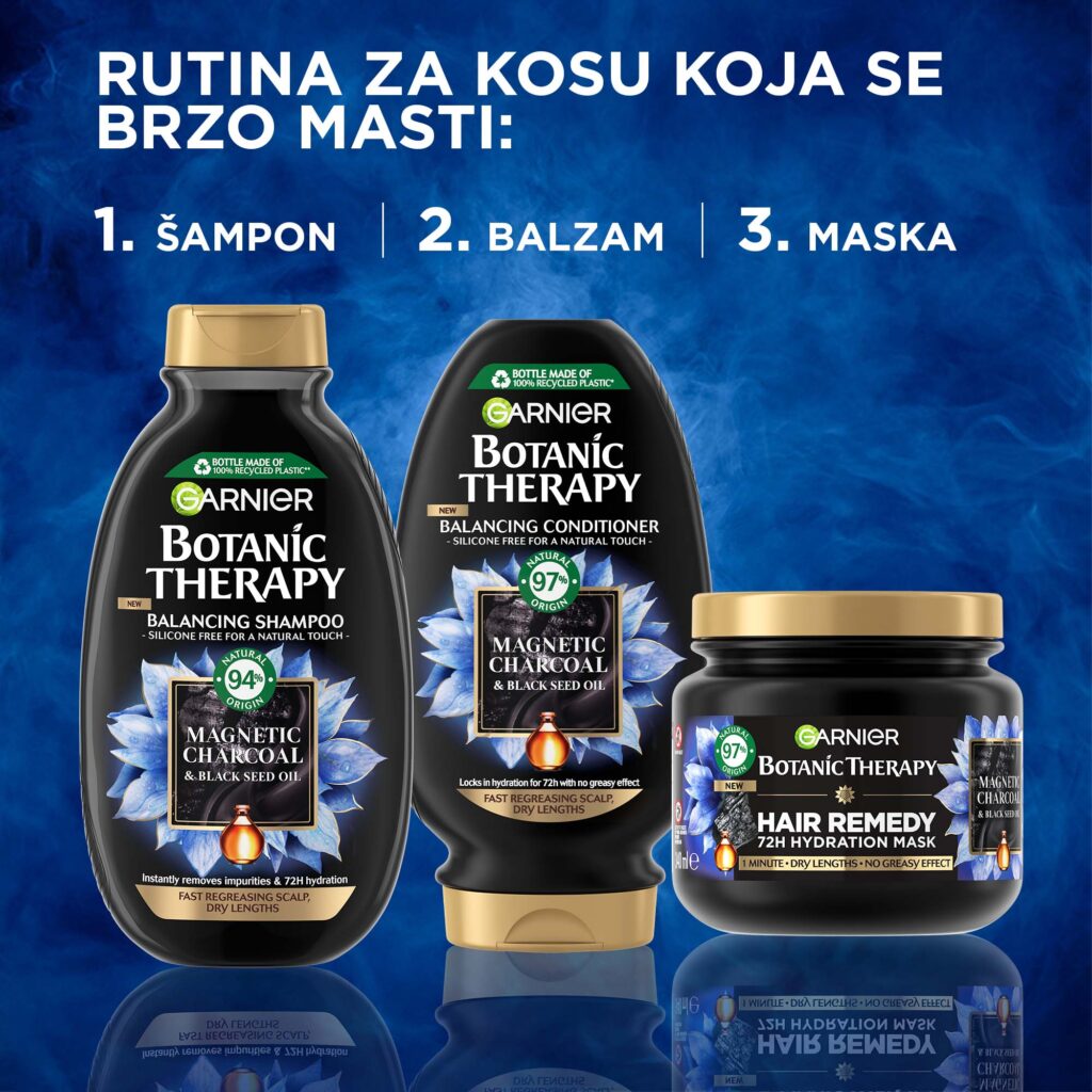 Garnier Botanic Therapy Magnetic Charcoal uklanja sebum sa temena, pročišćava teme i uklanja do 81% nečistoća (instrumentalni test, rezultat nakon 3 šamponiranja), dok zadržava hidriranost kose 72h (Instrumentalni test, šampon+balzam).