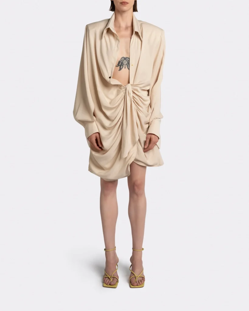 Mini-haljine sa podstavljenim ramenima pojavile su se u izobilju na pistama za jesen-zimu 2025/26. Stella McCartney je kreirala model oštrih, četvrtastih linija, bogato drapiran u tonovima bledo ružičaste, savršen za doček Nove godine.