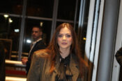 Njena kombinacija bila je suptilna lekcija iz proporcija i tekstura: crne helanke visokog struka, kao čista osnova, uparene s oversized džemperom u krupnom karo dezenu tonova kafe, čokolade i vanile. Svetle sude čizme do polovine lista, sa mekim naborom i tankom potpeticom, uvele su u ovaj outfit vertikalu i dozu prefinjenosti, dok su crna torbica i crveni lak na noktima bili jedini akcenti koji su doneli dozu ličnog potpisa.