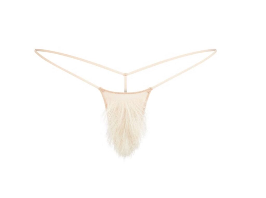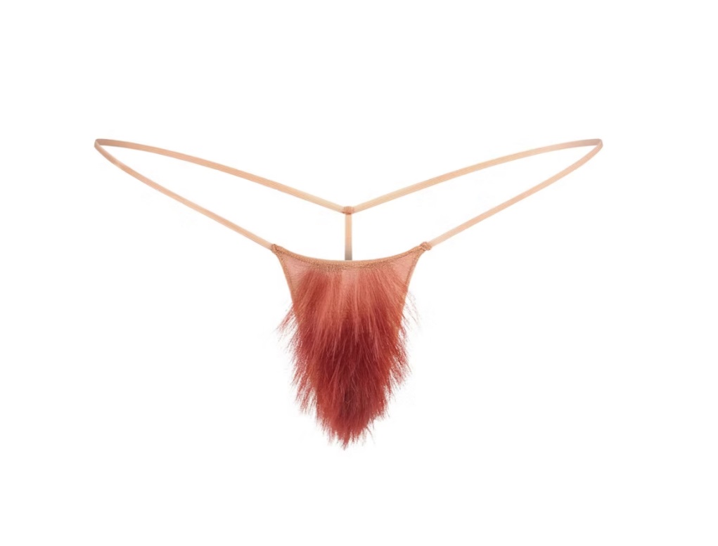 Najnovija SKIMS Bush Thong je mikro tanga od providne mrežice, ručno ukrašena mešavinom kovrdžave i ravne veštačke stidne dlake. Dostupan je u 12 nijansi, tako da, kako kaže SKIMS tim, „tvoj tepih može biti koje god boje želiš“.