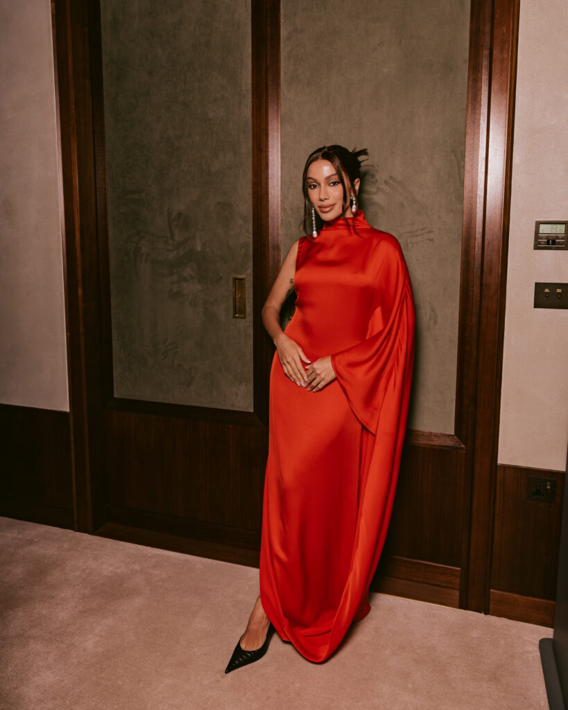 Anitta je imala na sebi posebno rađenu varijaciju jednog komada iz predstojeće kolekcije – dugu crvenu haljinu do poda, sa upečatljivim krojem.