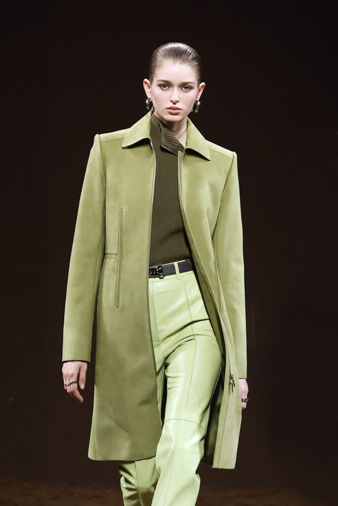 Trend kožnih pantalona u boji uočen je i na pistama, piše italijanski Vogue. Khaite se odlučio za crveni model, dok je Hermès akcenat stavio na kiselo zelenu nijansu, kreirajući sofisticiran „ton-sur-ton“ izgled.