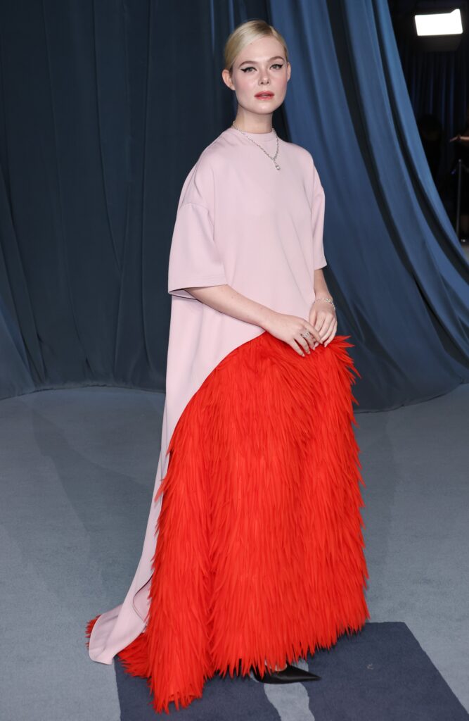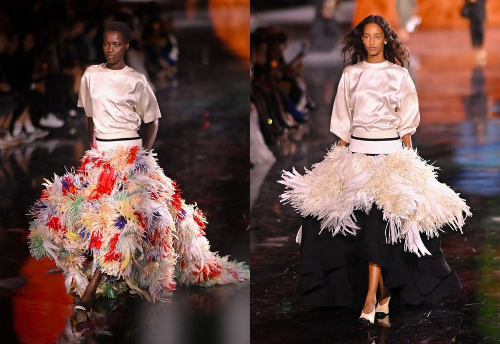 Chanel je prikazao duge suknje, raskošne i dramatične – spoj perja i aplikacija koje se spiralno penju od struka do poruba, prateći asimetrične linije u belim ili intenzivnim tonovima. Bluza je luksuzna, ali jednostavna – sjajna svila u svojoj najčistijoj formi.