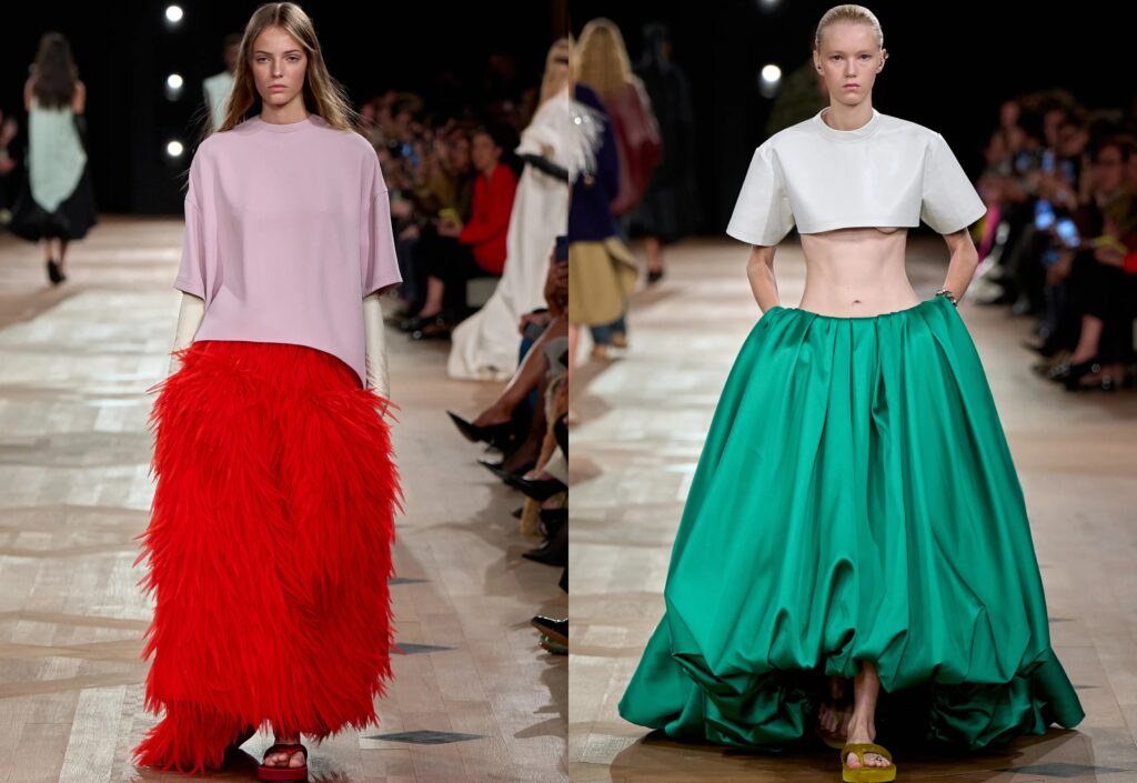 Valentino donosi duge, bogate suknje u jarkim nijansama, ukrašene perjem ili u balon formi. Gornji deo ostaje minimalistički, ali se poigrava krojem: kratak, konkavan ili hrabro kropovan.