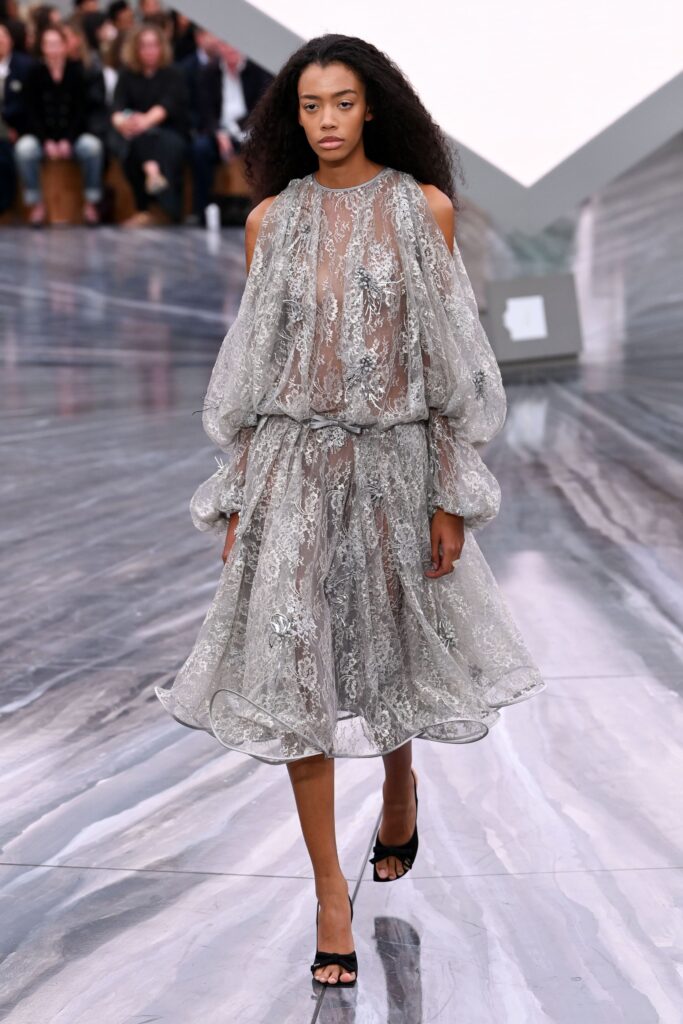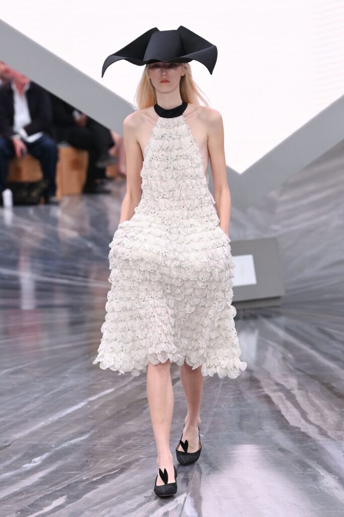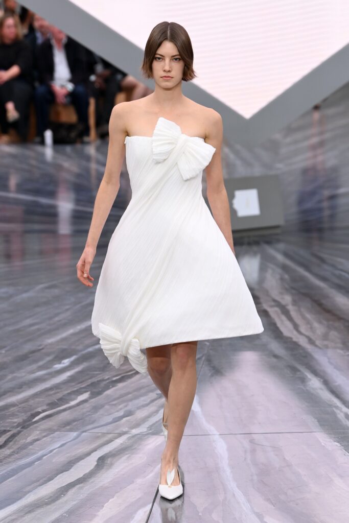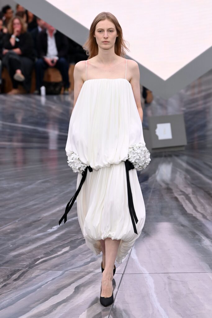 Nakon što je publici predstavio bogatu istoriju kuće i istakao gotovo svaku eru Diora, Anderson je otvorio reviju s belom haljinom bez bretela, sa skulpturalnom krinolinom i mašnama kao detaljima.