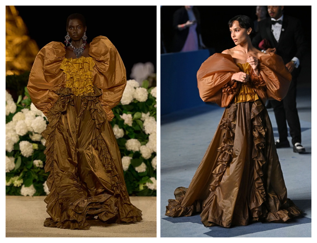 Zoë Kravitz je nosila kombinaciju iz završnog dela revije Anthonyja Vaccarella za Saint Laurent, koja se pomerila od seksi kožnih mantila, suknji olovka kroja i naglašenih ramena ka lepršavim bluzama sa mašnama i naborima u tonovima dragulja. Njena kombinacija je definitivno bila najviše primećena i komentarisana.
