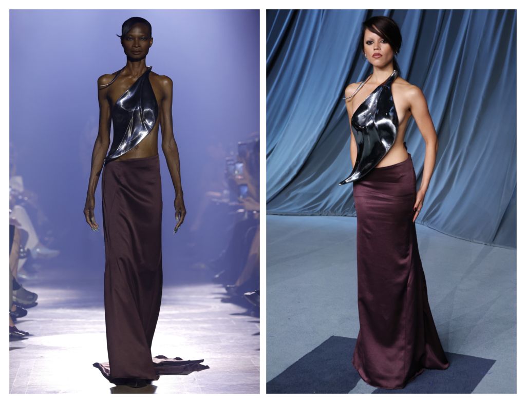Jenna Ortega i njen stilista Enrique Melendez inspiraciju su pronašli bliže kući. U skladu sa njenim već dobro poznatim „goth glam“ stilom, Ortega je odabrala srebrni oklopni top i suknju u boji čokolade dizajnerke Grace Ling iz Njujorka – prvi model iz njene očaravajuće i senzualne kolekcije sa NYFW-a za proleće 2026.