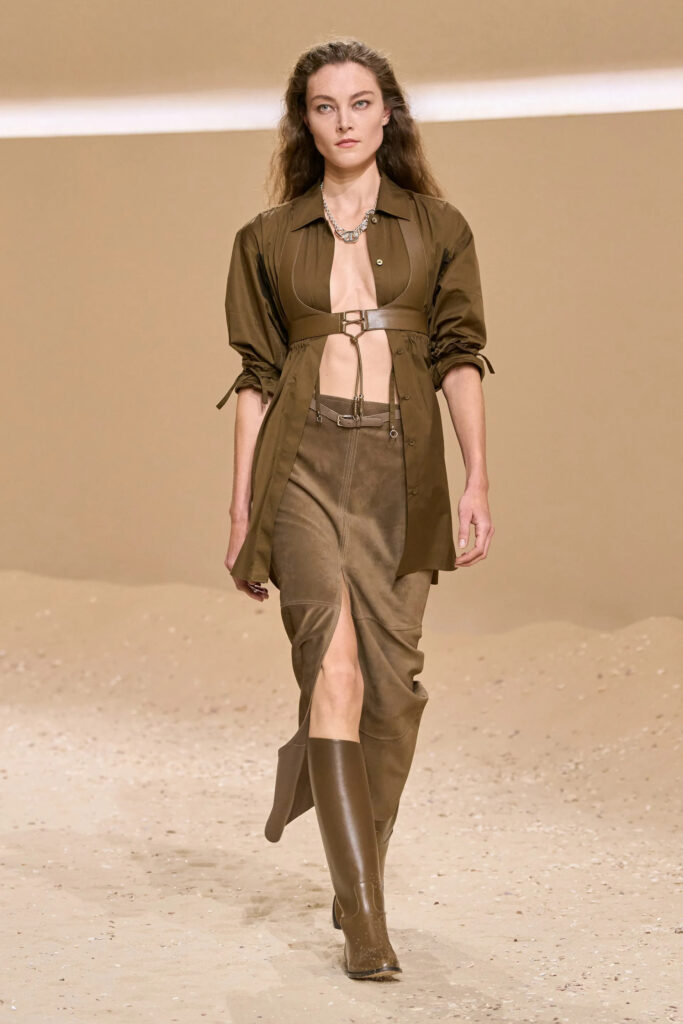 Alaïa se poigrava volumenom i bira asimetričnu crvenu suknju, dok Hermès ostaje veran klasici sa modelom od antilopa u kaki boji sa prednjim šlicem.