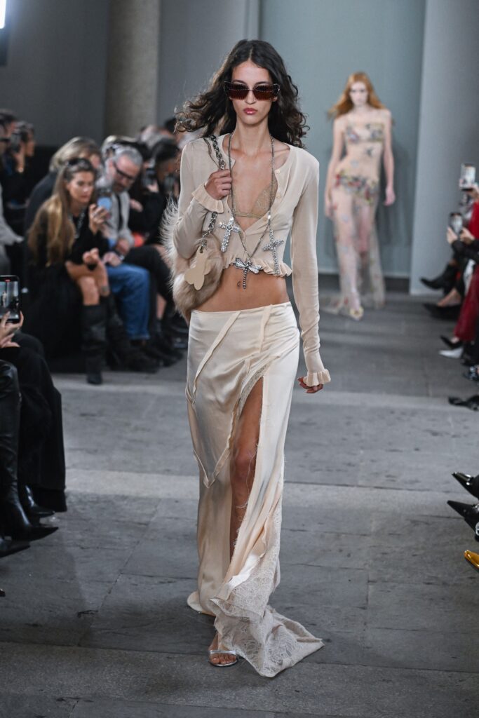Bottega Veneta se opredeljuje za svedenost, uz sivi model nabran u struku sa faltama i ušicima. Blumarine i Fendi naginju romantici, svako na svoj način, ali jednako šarmantno.