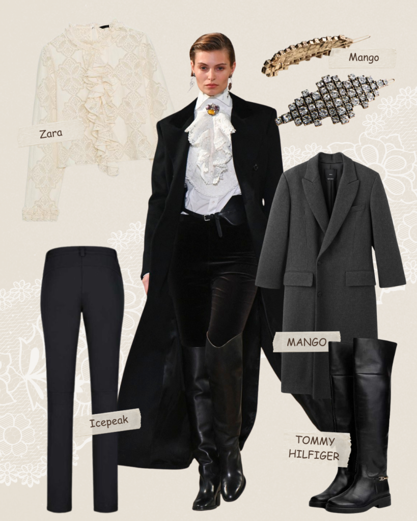 Ko je rekao da čizme iznad kolena ne mogu da se nose i na posao? I to ne ispod duge suknje, već uz uske pantalone. U ovoj kombinaciji igra materijalima daje efekat – uske crne pantalone, crne čizme iznad kolena, strog i dugačak kaput su razbijeni belom košuljom sa karnerom, a u sve to ubacite i neki efektan ali decentan nakit.