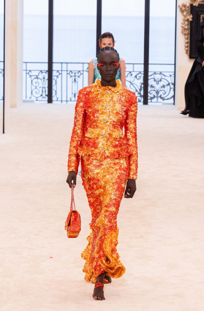 Kao što se i očekuje od Blazyjevog Chanel-a, kolekciji ne nedostaje razigranosti, radosti i boje. To se najviše vidi u motivu sirene, koji dolazi do izražaja kroz haljine ukrašene perlama i šljokicama nalik ribljim krljuštima, koje svetlucaju u pokretu, kao i kroz detalje školjki i vodene teksture koje iznenađujuće upotpunjuju jednostavnije kombinacije.