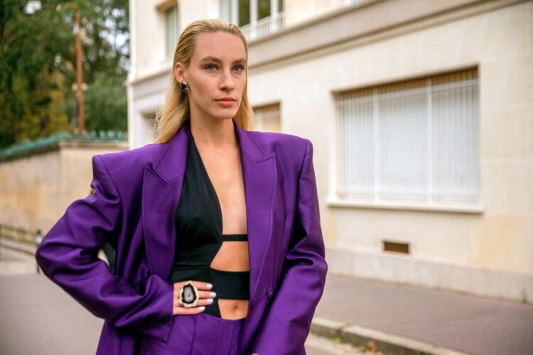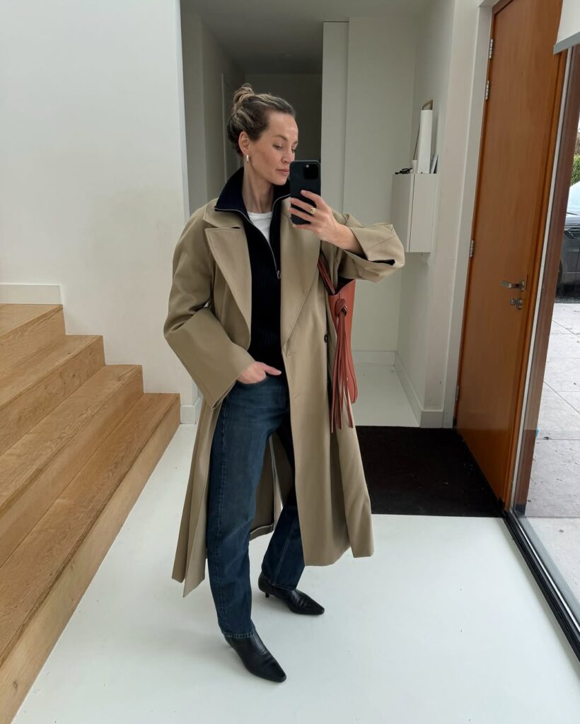 Kombinacija Clare Dyrhauge uključuje sivi kaput s pojasom, veliku torbu od antilopa, opuštene farmerke i crne čizme s malom kitten potpeticom.
