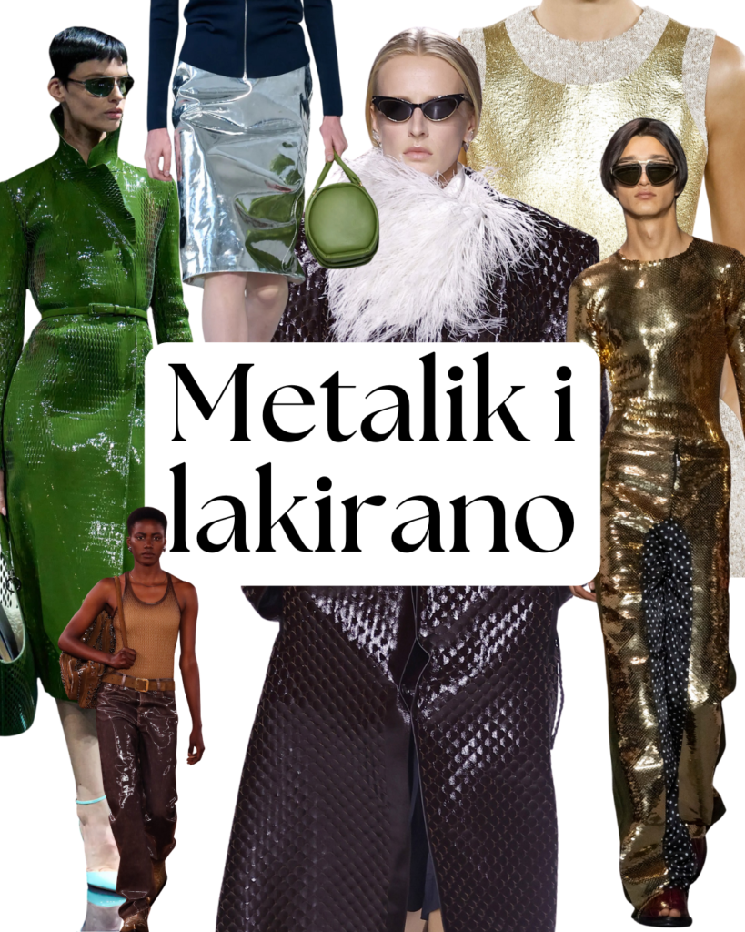 Dizajneri prihvataju svetlucave materijale – od potpuno pozlaćenih haljina do suptilnih metalik aksesoara. Umesto da budu rezervisani za specijalne prilike, metalik komadi se nose i preko dana i u večernjim izdanjima, pojavljujući se u vidu kožne garderobe nalik na oklop, tkanina sa efektom tečnog metala, lančanih mreža i svetlucavih detalja.