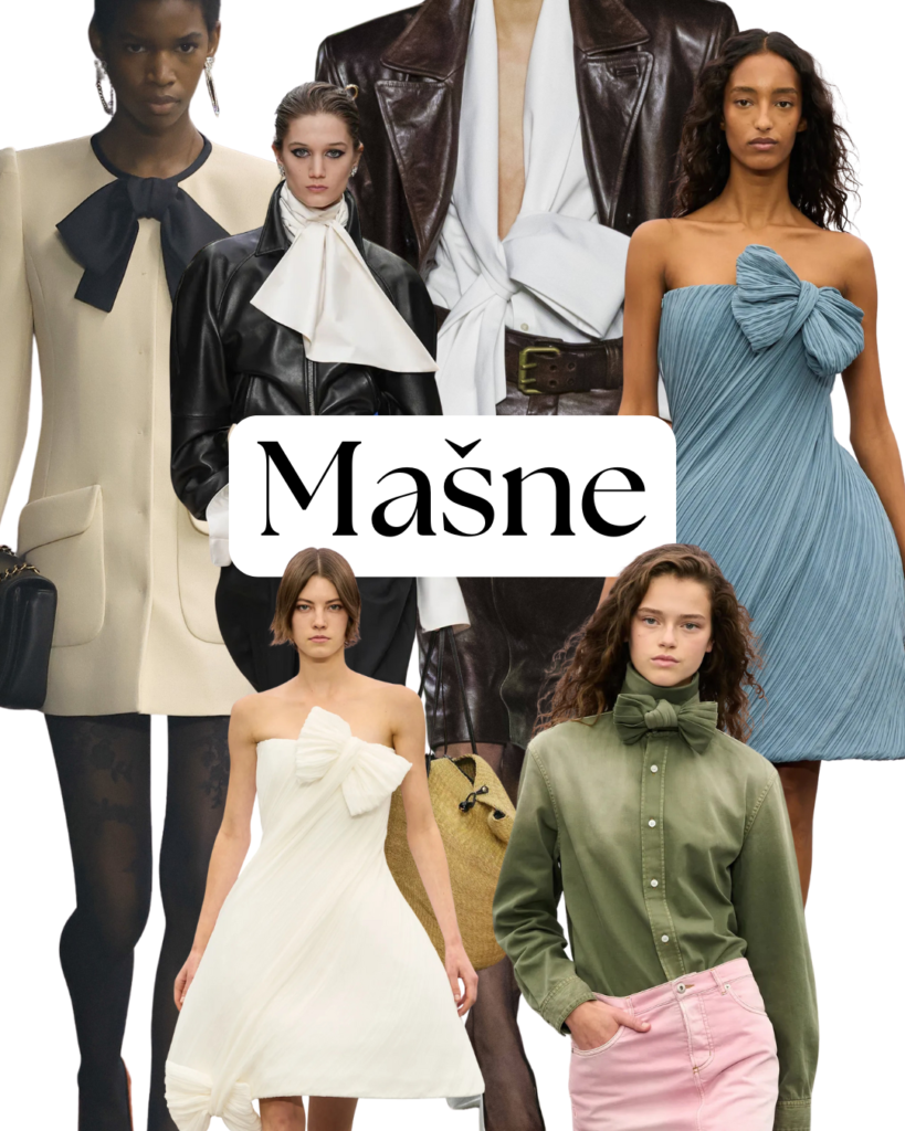 Mašne su doživele veliki povratak, pojavljujući se u različitim dimenzijama – od sitnih, romantičnih detalja na haljinama do velikih, skulpturalnih ukrasa na ramenima i struku. Ovaj trend daje klasičnim siluetama svež i savremen izgled.