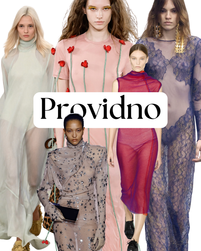 Na modnim pistama za proleće/leto 2026. providni komadi zauzeli su centralno mesto, ističući igru svetlosti i slojevitosti kroz lagane materijale poput tila, organdina i mrežastih tkanina. Ovaj trend naglašava senzualnost i sofisticiranost, često kombinovan sa strateški postavljenim vezom, kristalima ili čipkom kako bi se zadržala elegancija i suptilnost.