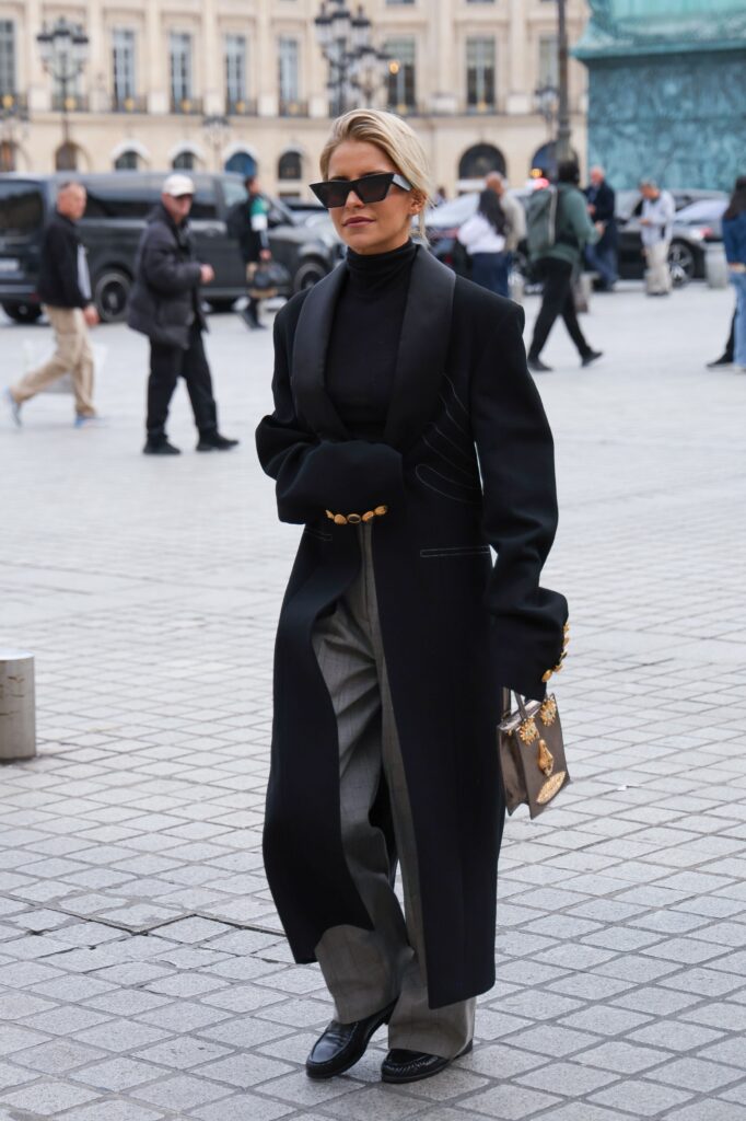Vrhunsku kombinaciju Caro Daur može da iznese svaka žena. Sivo-crna elegancija je ovde podignuta na novi nivo uz pomoć kaputa u smoking stilu.