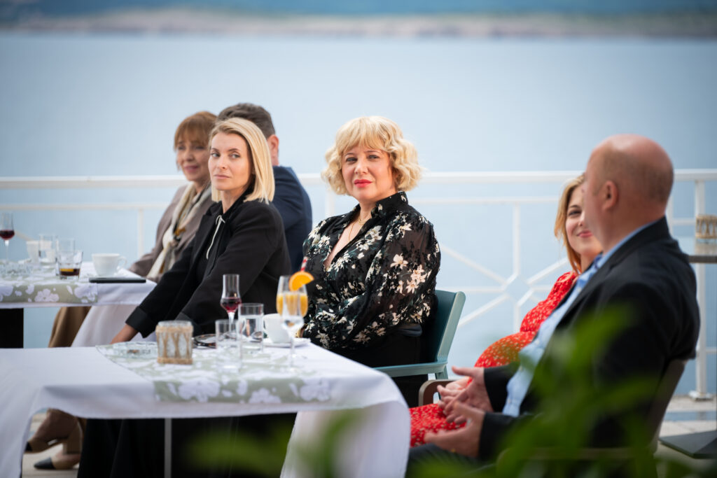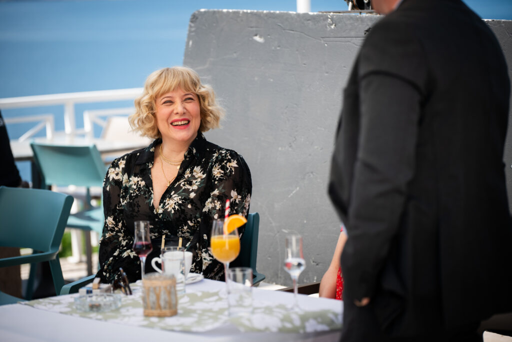 „Najživlji trenuci događaju se kada jedan pogled, misao ili mali gest zarazi ceo kadar smehom. Kamera snima, scena ide, a mi ne možemo da nastavimo. Vreme je novac, produkcija šizi, pa nas ponekad pošalju napolje da se smirimo jer smeh postaje neizdrživ – do suza. Ti trenuci neposlušnosti, kad te preuzme samo nečiji pogled, zajednička misao ili umor, prošire se kroz ceo pokušaj snimanja kadra kao zaraza. To nije samo reakcija nego oblik prepoznavanja i intime između ljudi u trenutku. Iako vreme na setu ograničava, upravo takvi trenuci stvaraju nezaboravne, žive trenutke koji ostaju u sećanju. Često se smejem kad pogledam neke od tih kadrova jer znam tačno gde i kad je šta bilo. A sad nešto sasvim drugačije! U hotelu u kom smo bili smešteni na moru, na snimanju na terenu, naši momci, glumci Roko Sikavica i Marko Grabež, proširili su priču da su videli divlju svinju napolju i da šeta noću oko hotela. Često sam brzim korakom prelazila put od šetališta do hotela da me slučajno ne presretne, pogotovo noću. Već sam videla horor komediju, divlja svinja koja čeka u zasedi, čita nam misli i onda ih govori naglas kad prođeš, dok te juri i probija se u hotel do sale u kojoj smo jeli.“